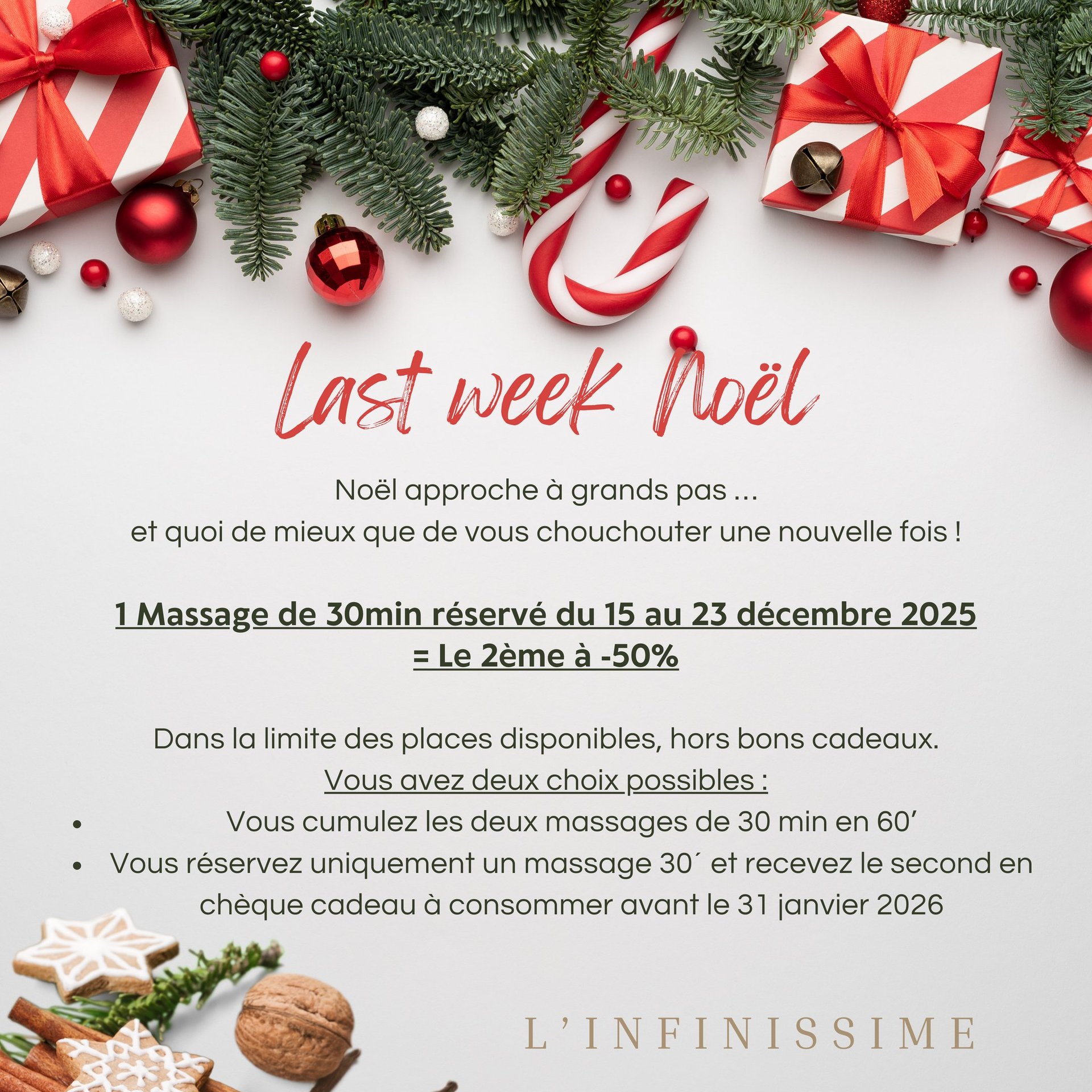 ❄️🎄 LAST WEEK de noël : 1 massage de 30' acheté, le 2ème à -50% (Voir la rubrique "Last Week")🎄❄️